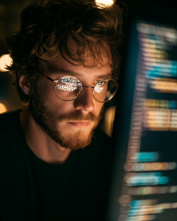 Portrait of a handsome young man with glasses and a computer in the dark.