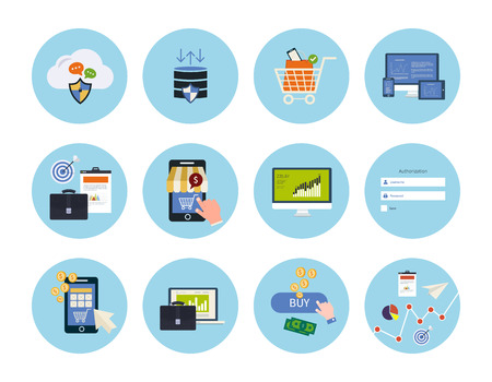 イラスト素材 - Set for web and mobile applications of data protection, online shopping, pay per click, analytics search information, internet security, seo, market research concepts items icons in flat design